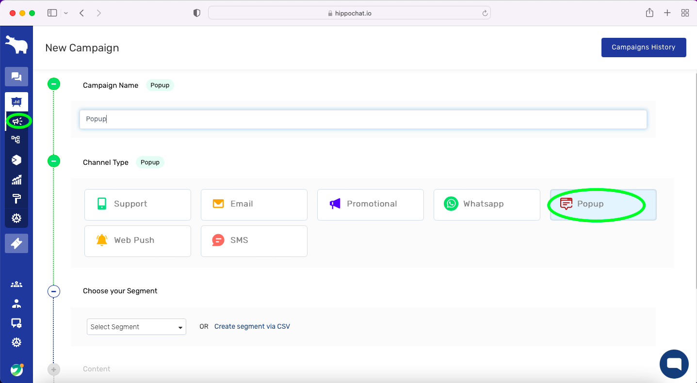 - Enter the campaign name and select the campaign type as “Popup” to create a popup campaign.