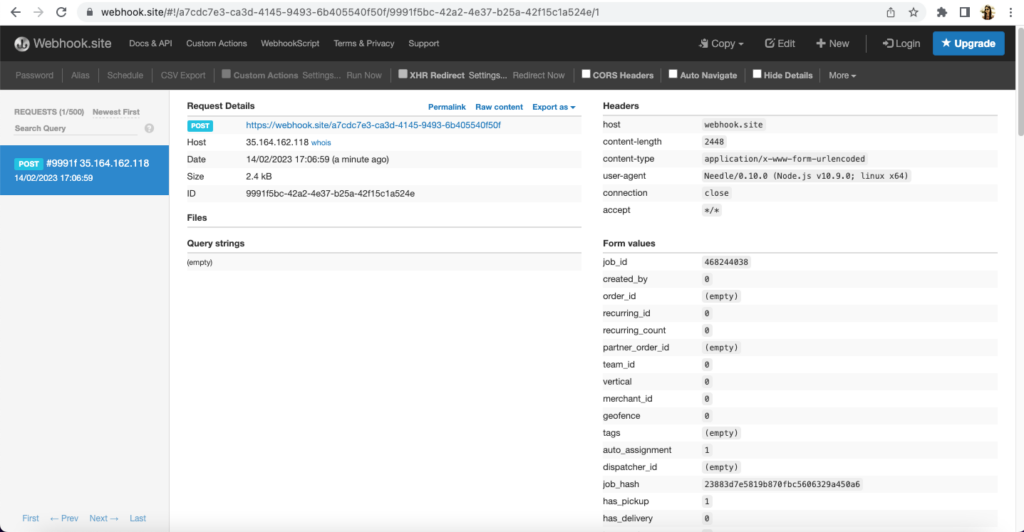 Similarly, you can configure the Webhook URL for other events. After configuring and enabling Webhook notifications for desired events, now create a test task to see the output result on that webhook website. When the task will be created on the Tookan side an output will also show on the webhook site. For the output on the Webhook site please refer to below screenshot: