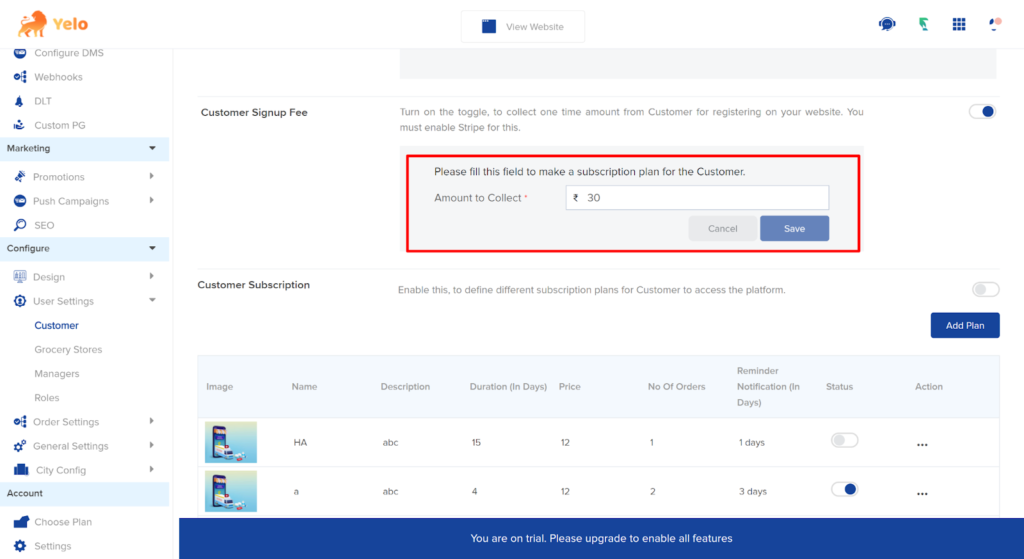Step 10: Next, you can add the Customer Signup Fee by activating the button. Make sure to enable the stripe button.