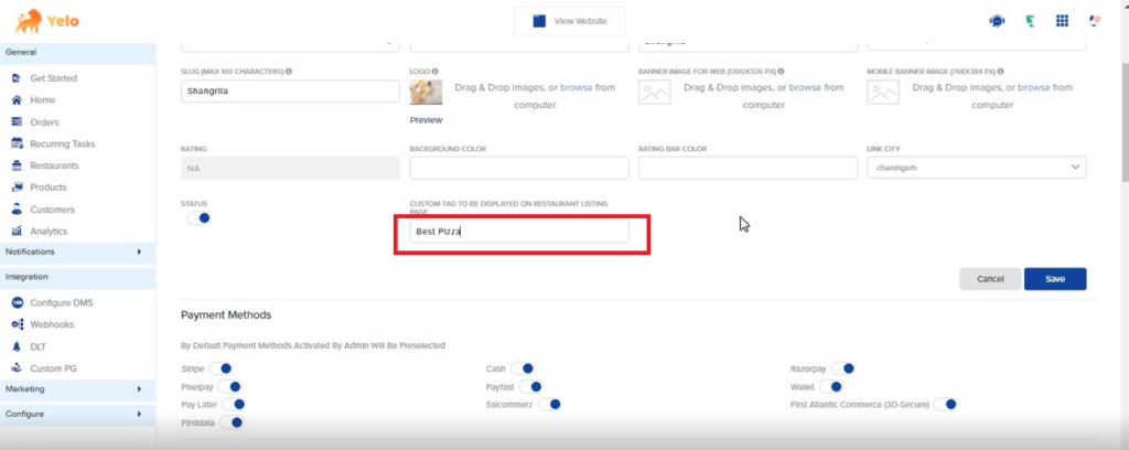 - Scroll to “Custom Tag To Be Displayed On Restaurant Listing Page” and enter your custom tag. Click on Save.